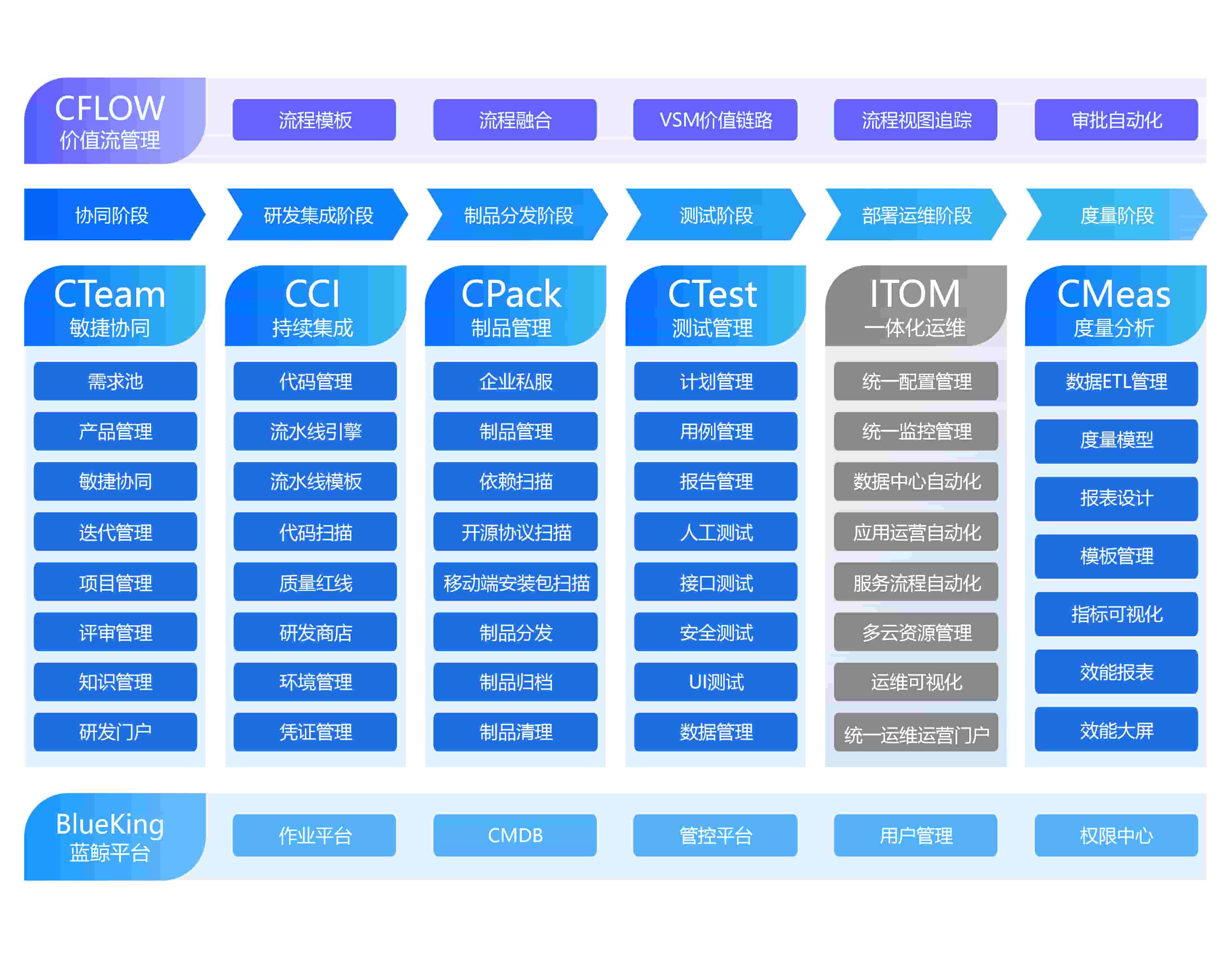 ● 技术底座-蓝鲸PaaS平台:依托蓝鲸PaaS底座共享项目、用户和权限等数据,实现研发运维一体化全域场景下的工程数据纳管与业务有效联动。