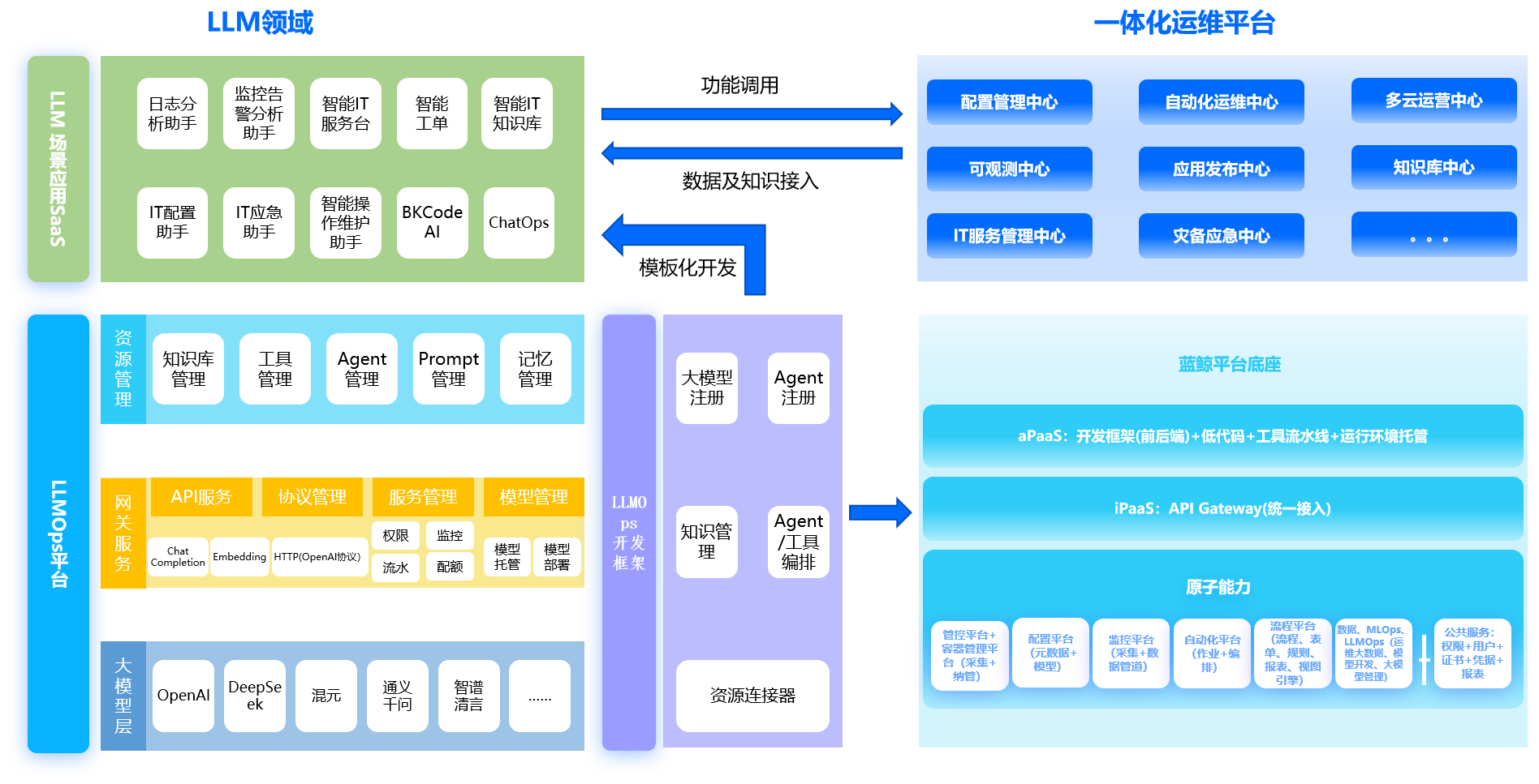 LLMOps 开发框架:LLM Agent Framework ,是一个 LLM 智能 Agent 应用开发框架,提供单 Agent 智能代理与基于 Graph 编排的多 Agent 智能协同能力,使用 Graph 组合 Agent, Chain, Retriever 等各类子组件,编排业务流程,解决复杂多变的业务问题,同时最大程度保留可复用性。运维智能体作为整个嘉为蓝鲸一体化运维体系的一部分,与一体化运维系统之间通过功能调用、数据和知识接入,形成有机互动,实现更为丰富的场景化应用。