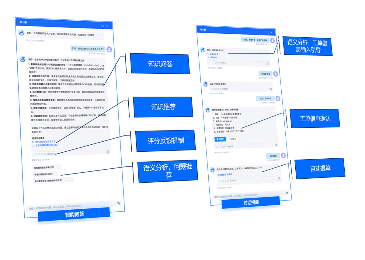 支持根据知识类型创建多个不同层级的知识库,支持文件上传、手工录入、网页知识等多种形式录入知识,并使用 RAG 技术进行向量化处理,可在聊天过程中指定回复引用特定的知识库。