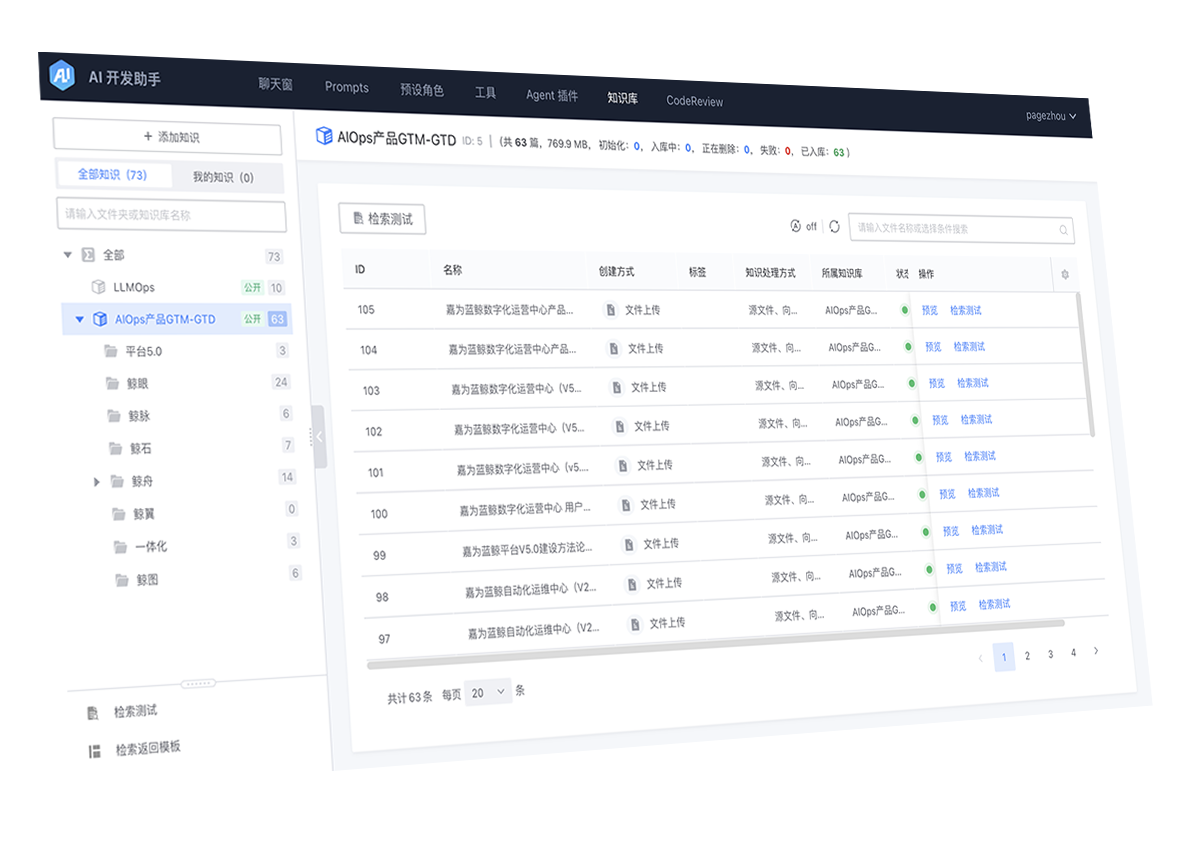 资源管理层:LLM 资源管理提供了 AI 场景建设过程中用到的各种通用资源、工具的支持。包括Prompt 管理、知识库管理、工具管理、AI Agent 管理等。这样各个运维SaaS可以把提示词模板、运维知识文档,以及Agent插件托管到平台上,降低智能运维场景的开发成本,并能在一体化运维体系内打通复用,如通过多Agent协同,完成智能可观测场景的告警智能分析、根因定位、智能处置推荐等。