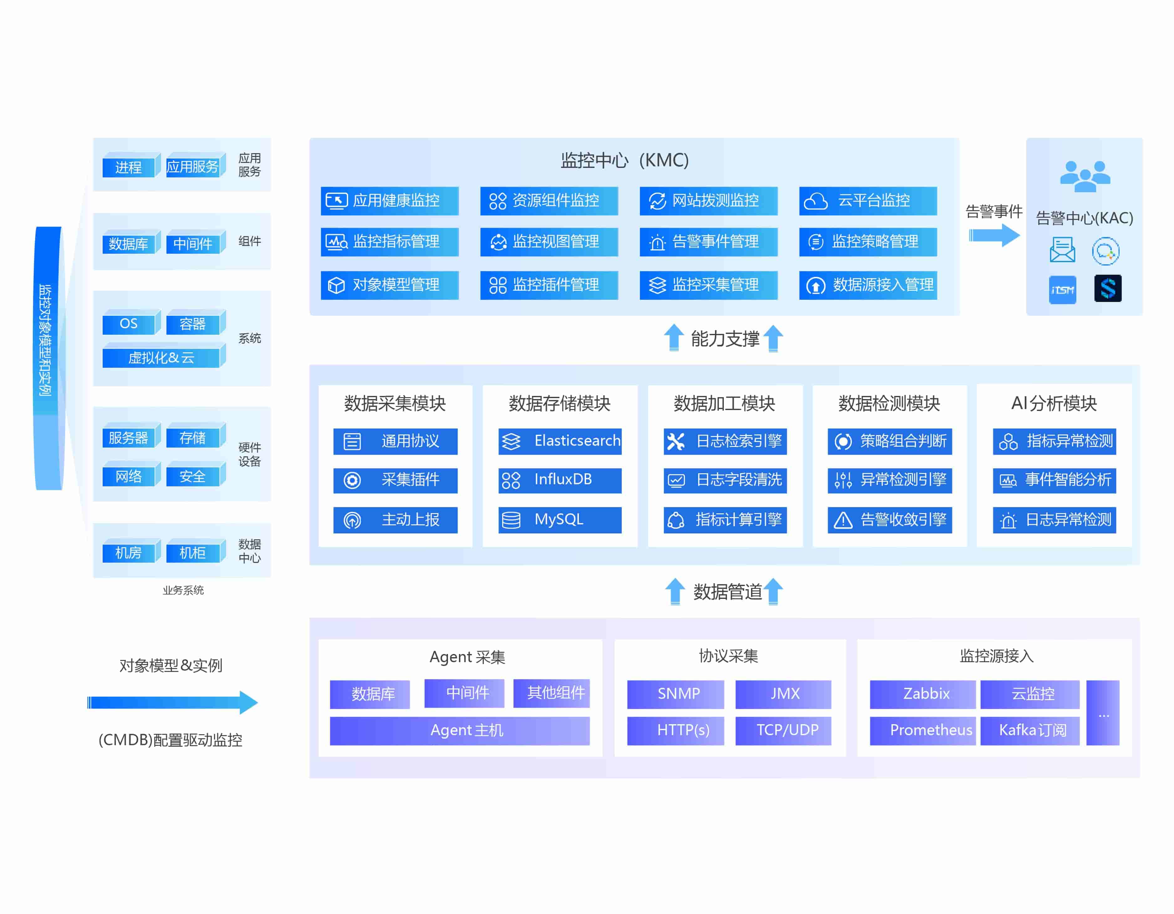 ● 能力层:覆盖监控通用能力,具备数据采集模块、数据存储模块、数据加工模块、数据检测模块。