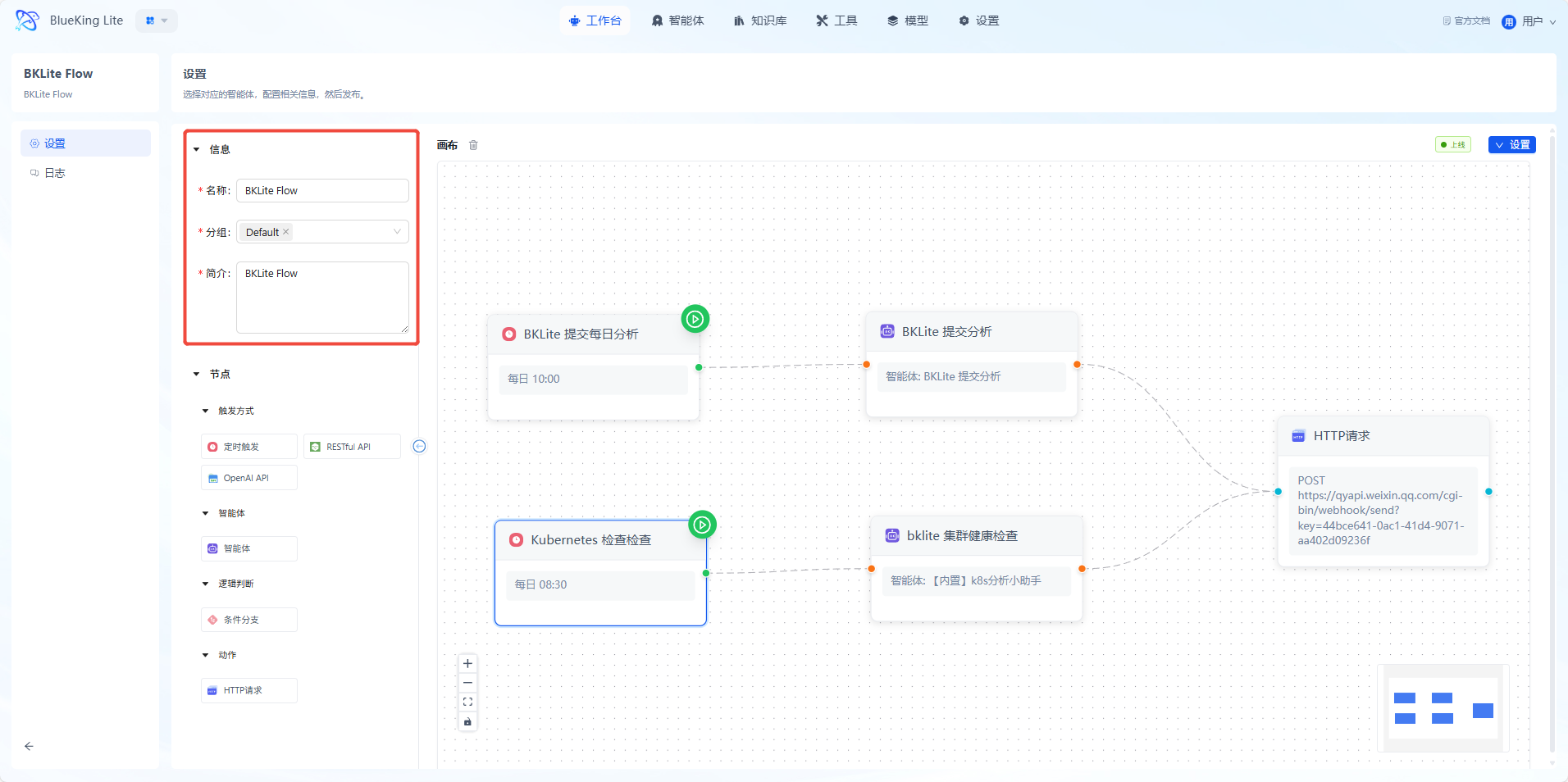 Chatflow是可视化工作流,通过画布拖拽节点实现流程管理。在“定时触发K8s每日巡检”场景中,定时节点设定触发时间,智能体节点调用K8s工具包执行巡检,HTTP请求节点输出结果到指定系统,通过该流程实现每日自动巡检。