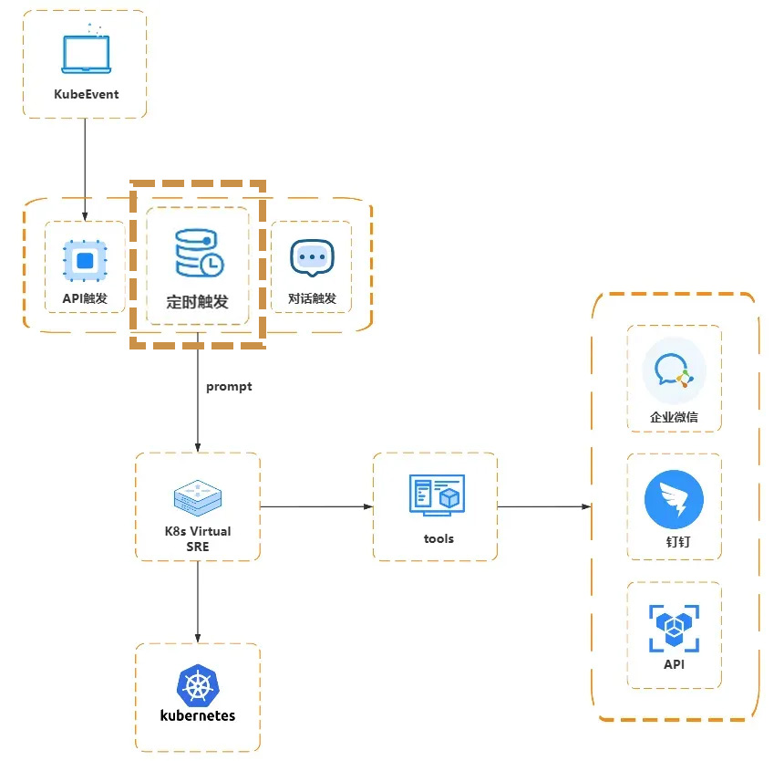 K8s智能体通过多种触发方式与K8s Virtual SRE协同工作,统一协调工具执行与决策。在执行过程中,既能支持人工介入,也能驱动自动化修复,从而实现从触发入口到反馈出口的全链路闭环。