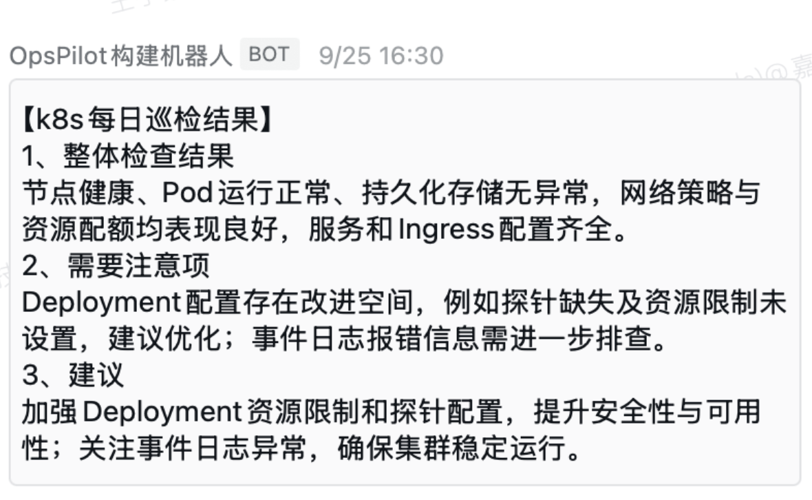 对于K8s定时触发得出的巡检结果,机器人会自动整理分析出整体检查结果发送给用户,且根据结果提出需要注意项,并给出加强和优化建议。