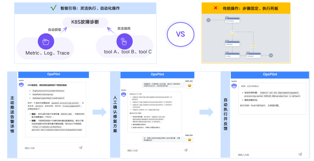 面对传统运维的痛点,OpsPilot基于大模型和MCP工具调度能力,重构了K8s集群管理流程,实现从被动响应到主动治理的升级。