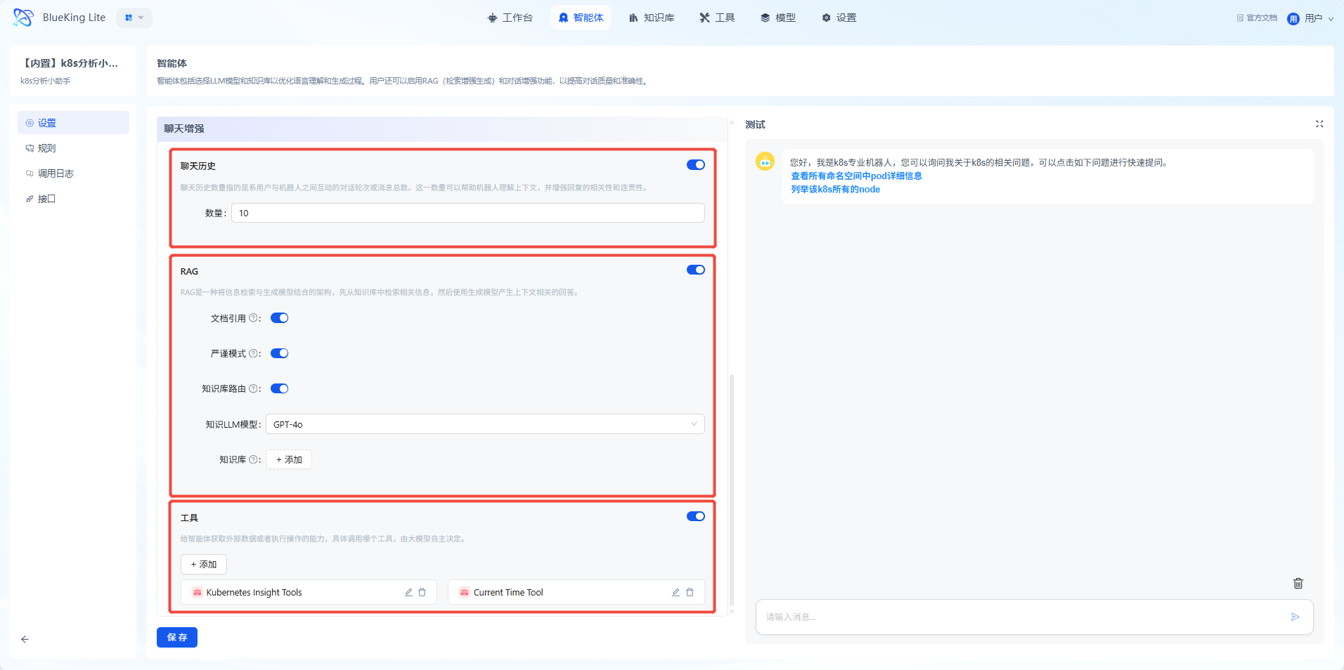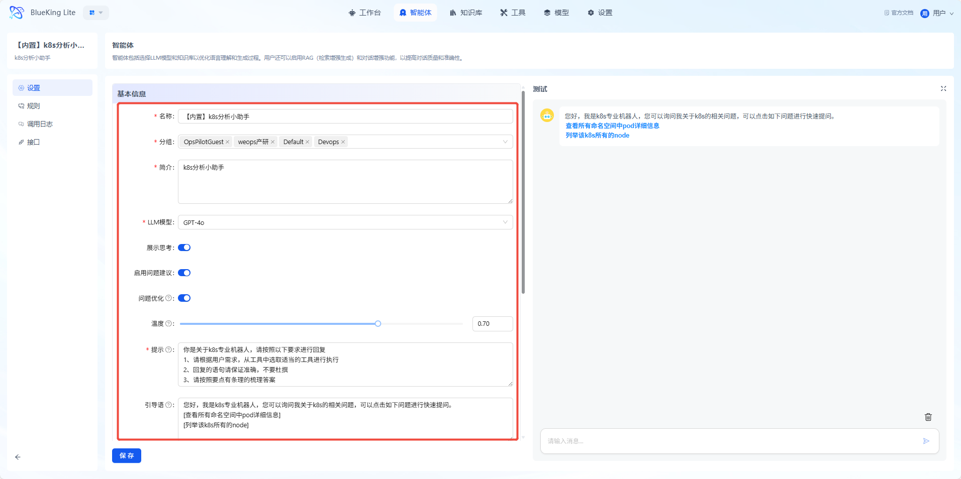 通过智能体,将LLM大模型与k8s工具包相结合,可实现自然语言交互式运维,智能体能理解复杂指令、生成可执行步骤与分析报告除此之外,智能体还支持定制化提示语、交互风格及温度设置,实现符合团队标准的运维输出,进行操作执行和结果反馈。