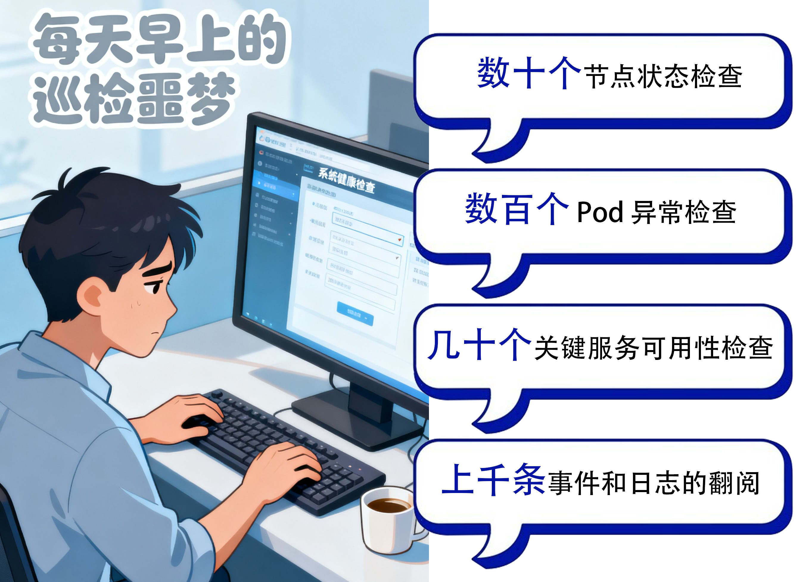 对K8s集群进行每日智能巡检,是保障业务连续性与系统稳定性的关键举措。K8s环境动态多变,每日的自动巡检能主动发现资源瓶颈、配置漂移、潜在故障等“隐形”风险,将问题扼杀于萌芽状态。这彻底改变了传统运维被动响应、依赖人工的低效模式,变“救火”为“防火”,是实现从被动响应到主动治理、提升运维韧性的核心基础。