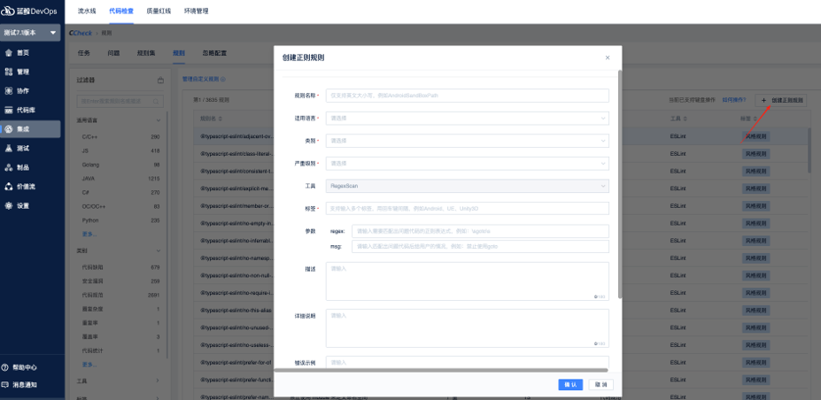 支持在规则列表中自由添加自定义正则规则,并应用于规则集。企业可根据自身安全与研发规范需求,自行设定检测规则,例如检查硬编码的密钥、验证常量命名规范、追踪TODO注释等,从而强化统一规范执行,提升团队代码质量