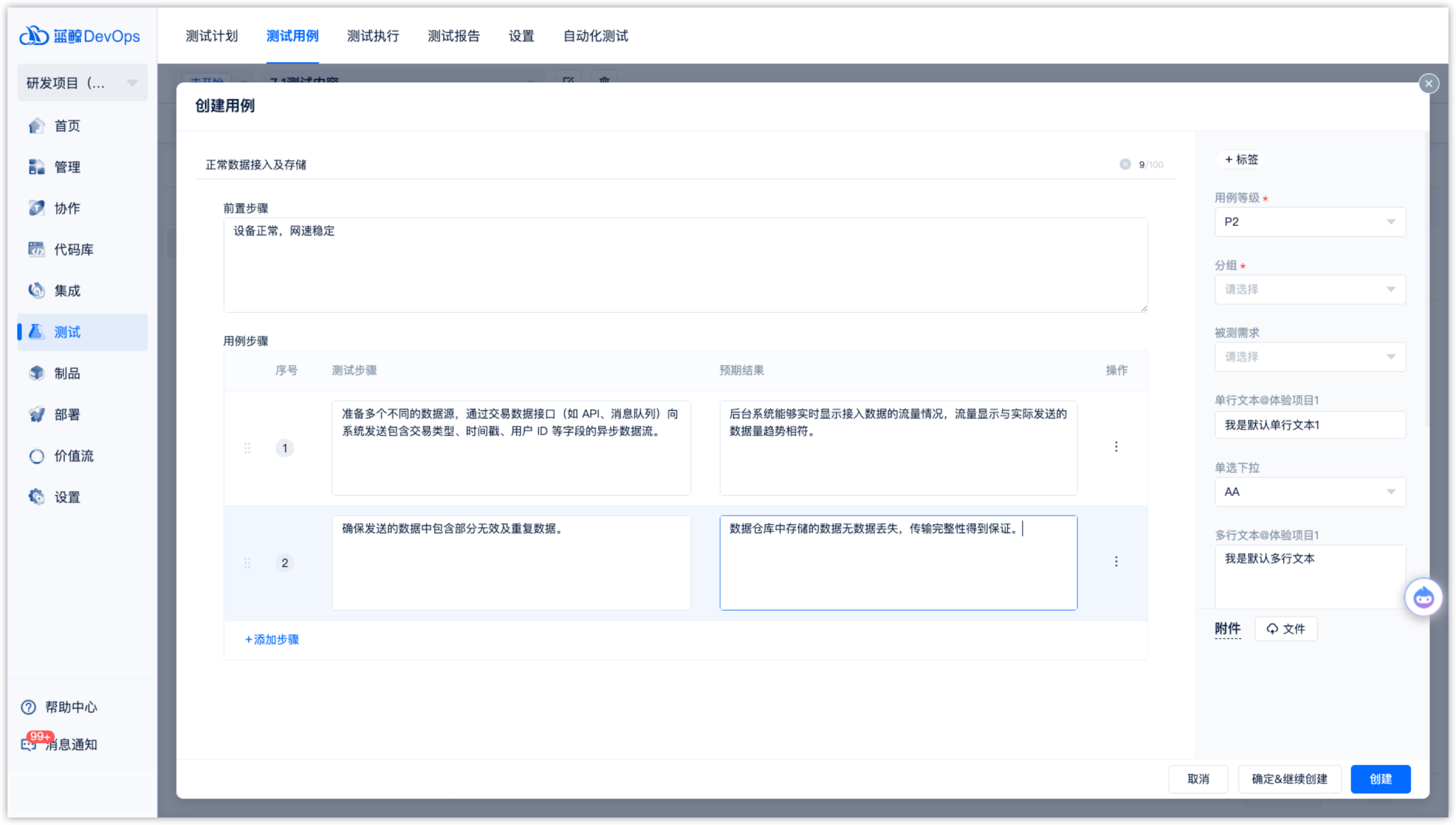 支持在设计测试用例时添加多条测试步骤与预期结果,精准梳理测试步骤之间的因果逻辑和先后顺序,提升测试用例质量。