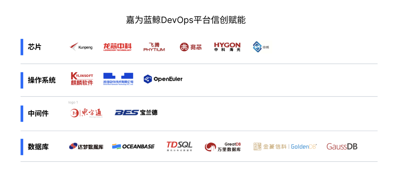 为响应企业信创战略落地需求,DevOps平台已完成多领域国产化产品适配,实现从底层操作系统到数据库、中间件的全链路信创兼容,筑牢研发体系自主可控底座。
