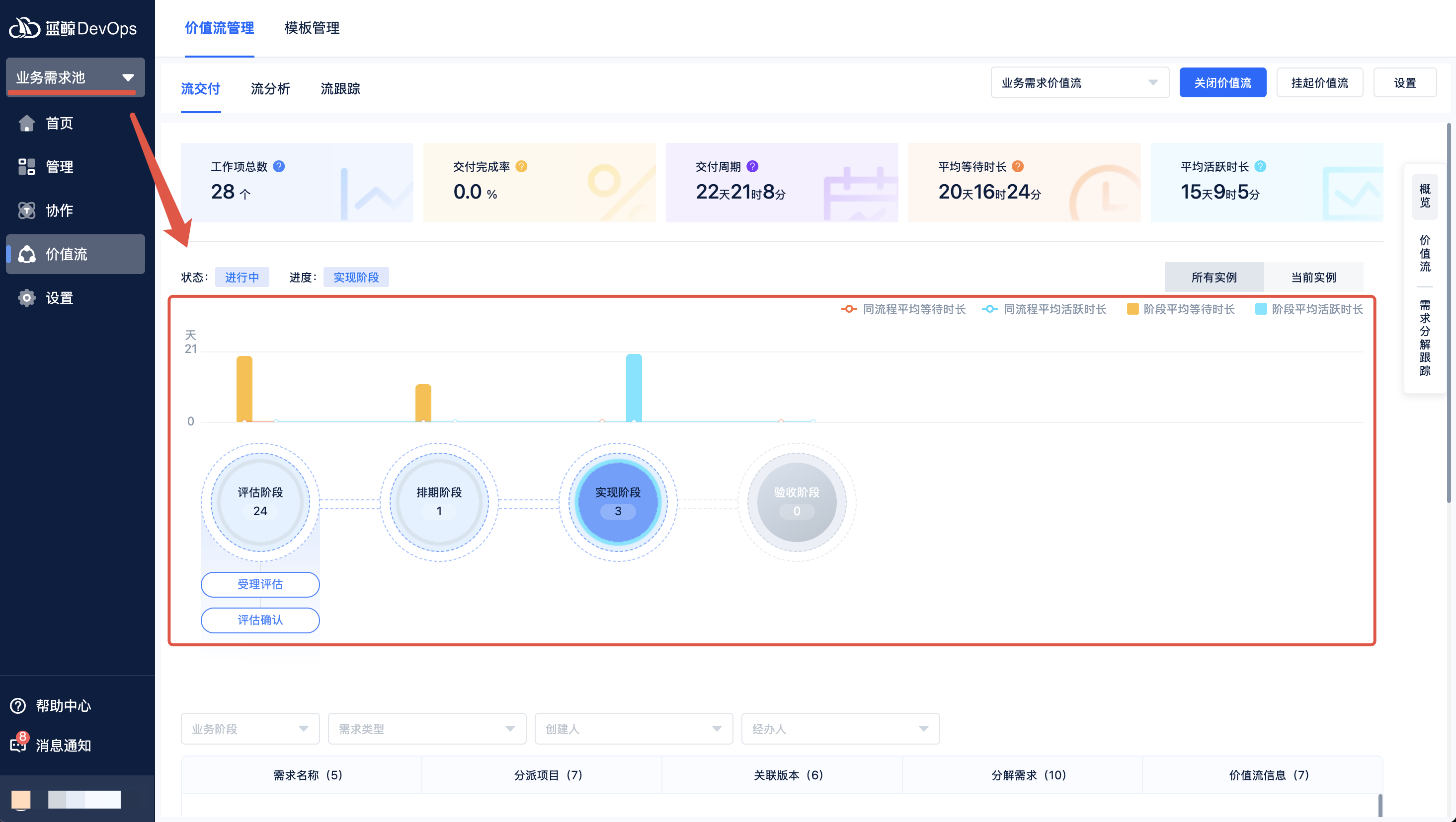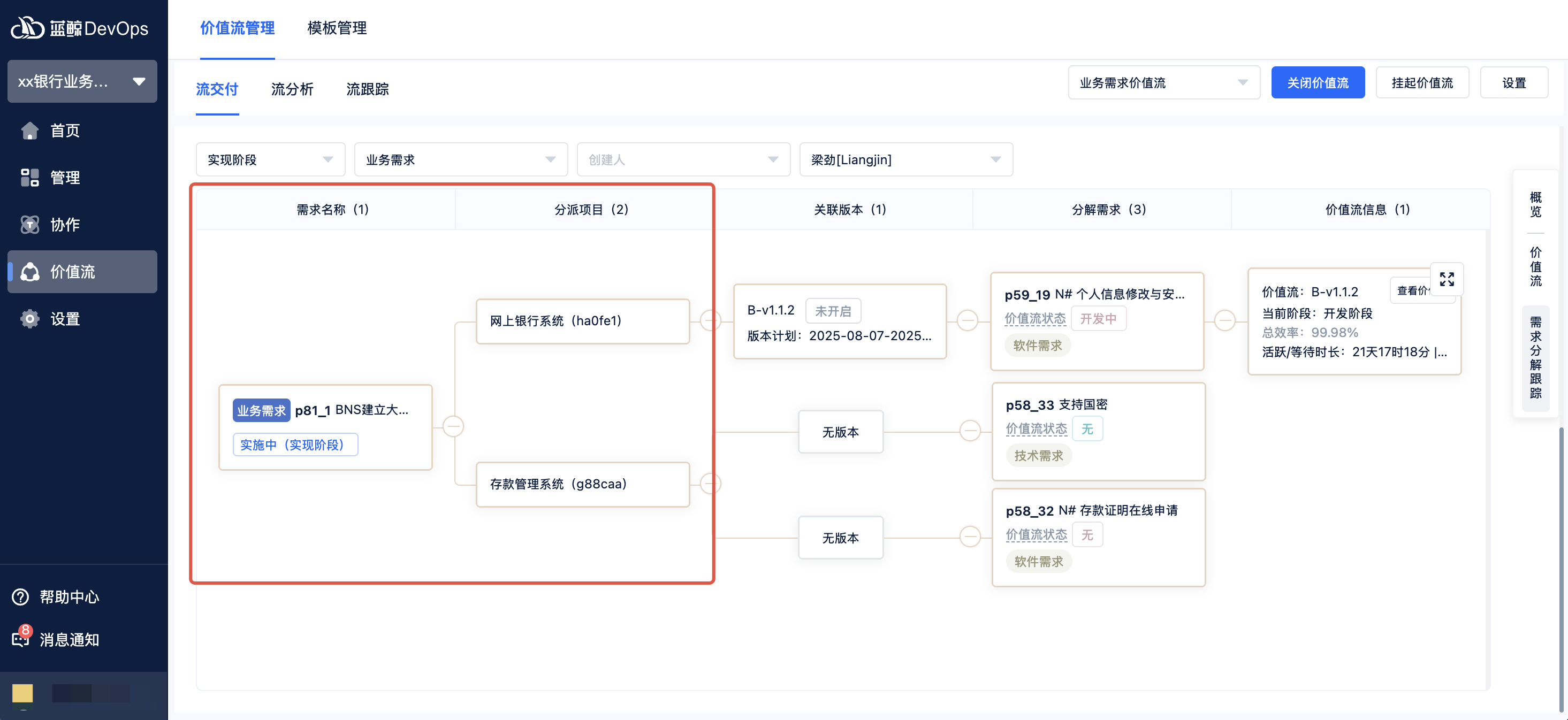 通过「需求分解跟踪」视图,可直观查看需求池价值流中每个业务需求被分派分派到哪些项目。