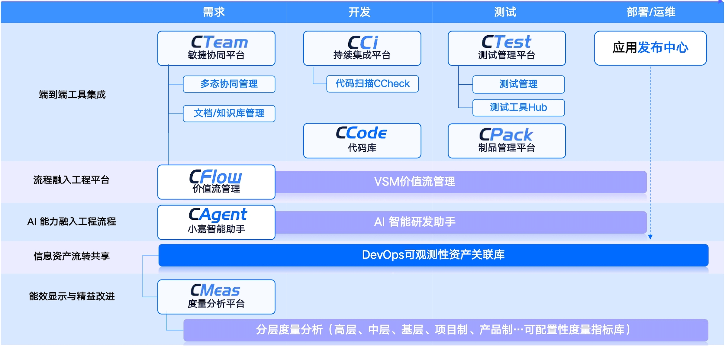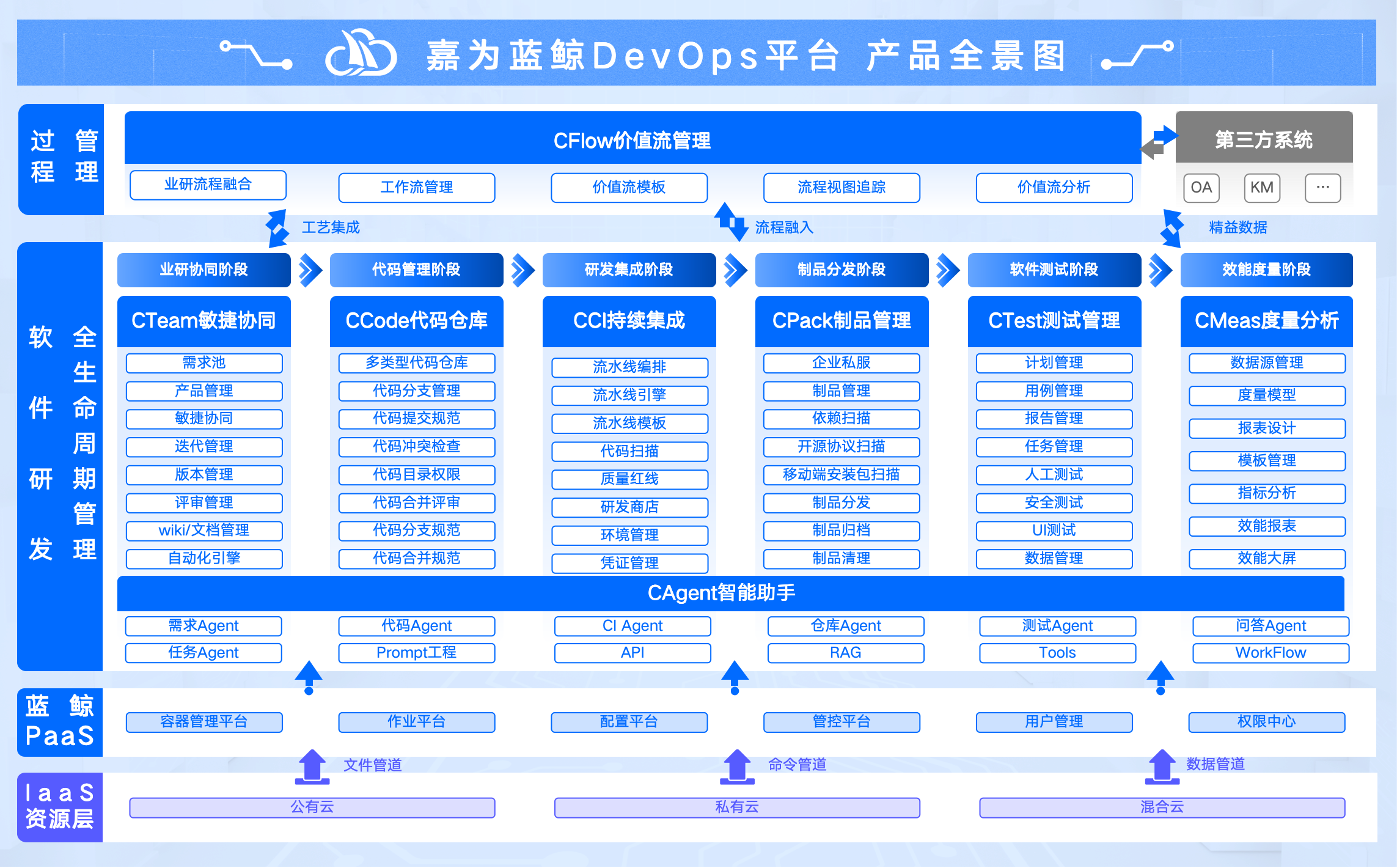 嘉为蓝鲸DevOps研发效能平台:一站式数字化转型DevOps解决方案,构建敏捷协同平台·CTeam、代码管理平台·CCode、持续集成平台·CCI、制品管理平台·CPack、测试管理平台·CTest、效能洞察平台·CMeas、价值流管理平台·CFlow、研发AI智能助手·CAgent八大能力模块,实现研发流程端到端贯通、团队协作高效协同、代码质量精准把控、制品流转安全可控、测试覆盖全面深入、效能数据智能洞察、价值流转清晰可视、智能工具辅助提效,以全链路数字化能力,助力企业打通从需求到价值交付的完整闭环,加速数字化转型进程,让研发效能与业务创新双轮驱动,为企业打造更具竞争力的数字化研发体系。