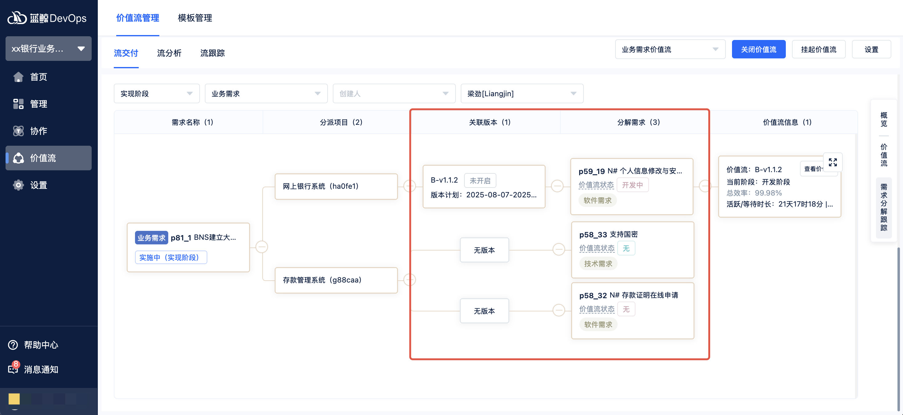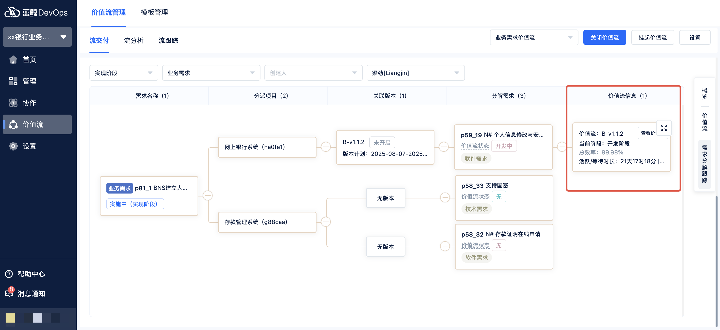 当发现分解需求进度异常或者版本发布滞后,可以直接点击「价值流信息」卡片下钻到下游价值流了解研发情况。