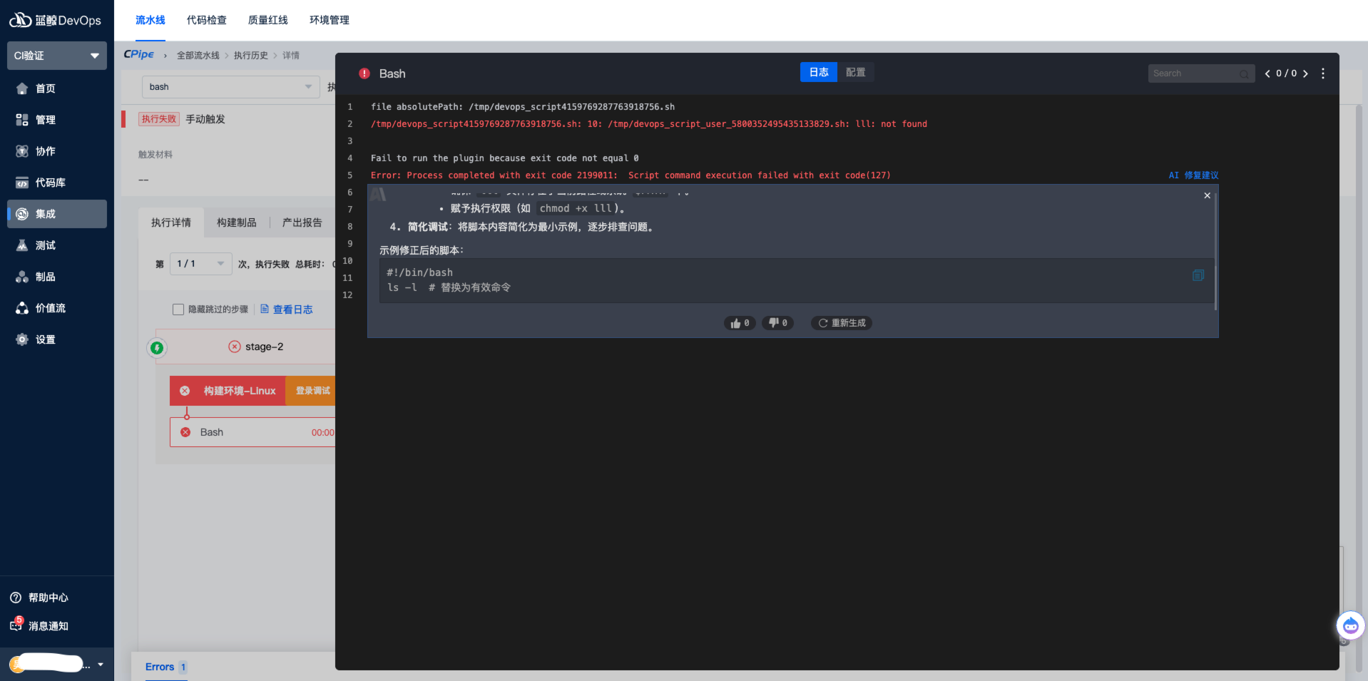 针对流水线执行过程中bash脚本报错信息,小嘉将给出对应的“AI修复建议”,减少人工排查的时间成本,帮助快速解决流水线执行过程中的故障。