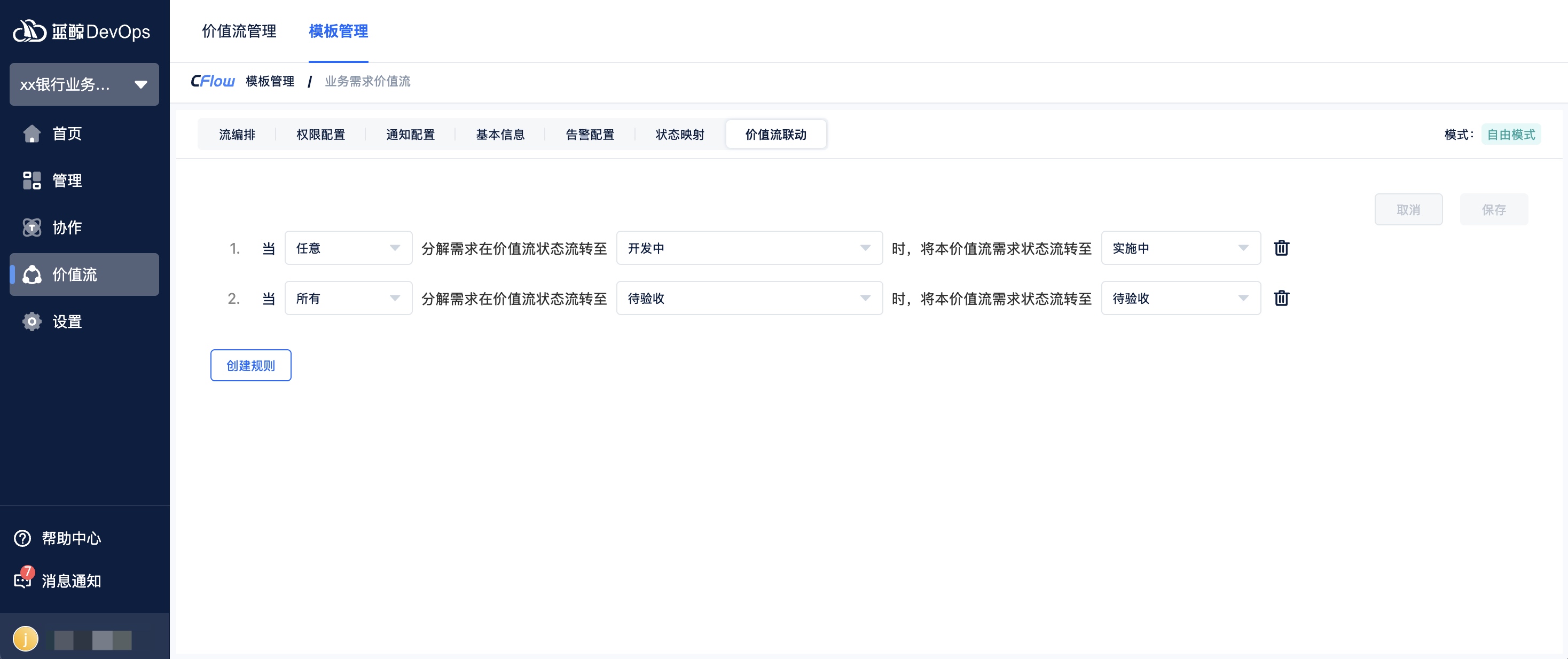 通过「价值流联动」配置,可以让分解需求价值流驱动源需求(如业务需求)价值流流动,实现需求进度及时更新,保证上下游流程节奏一致性。