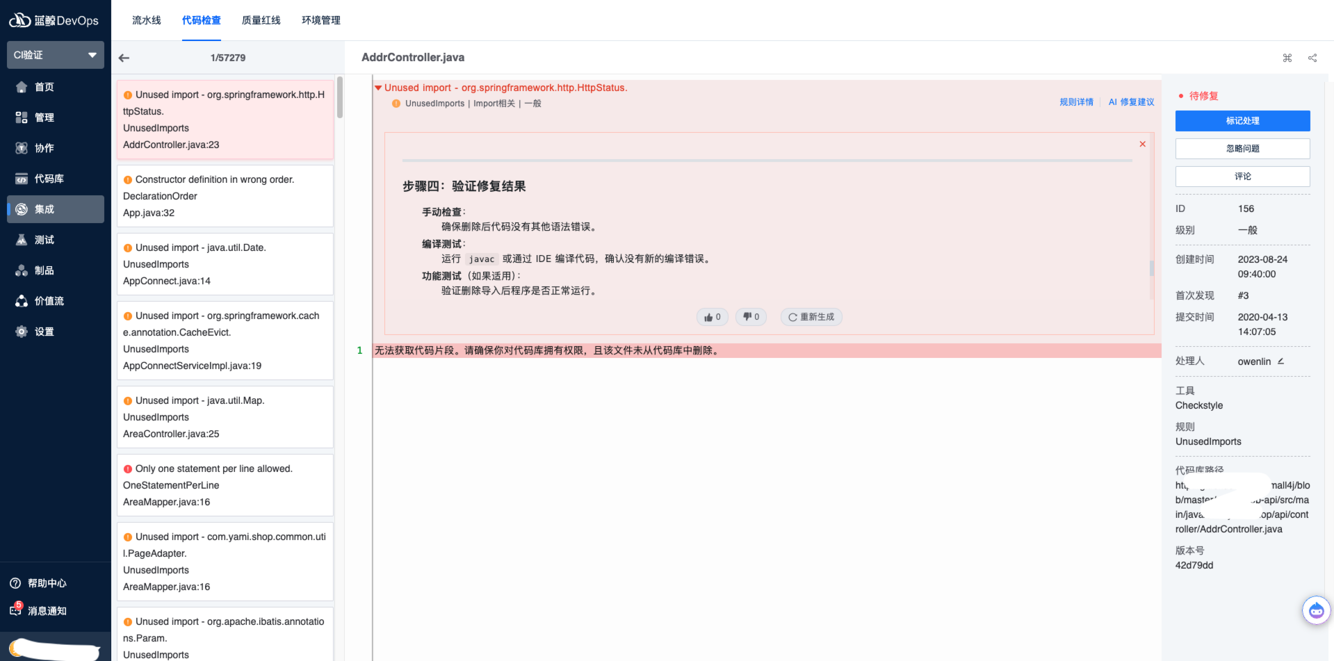 定位到代码检查发现的具体问题后,小嘉自动识别错误内容并给出“AI修复建议”,助力快速定位并解决代码问题。