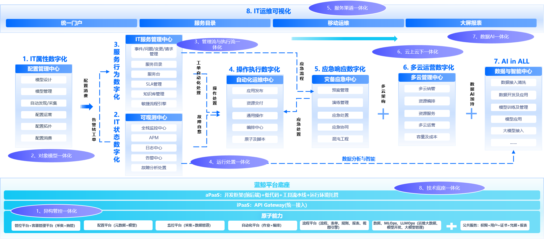 在智能运维领域,嘉为蓝鲸AIOps一体化、平台化、智能化运维解决方案以“全栈可观测 + 全流程自动化 + 全场景智能化”为核心,八大模块环环相扣、协同发力,构建起覆盖 IT 运维全生命周期的闭环能力。