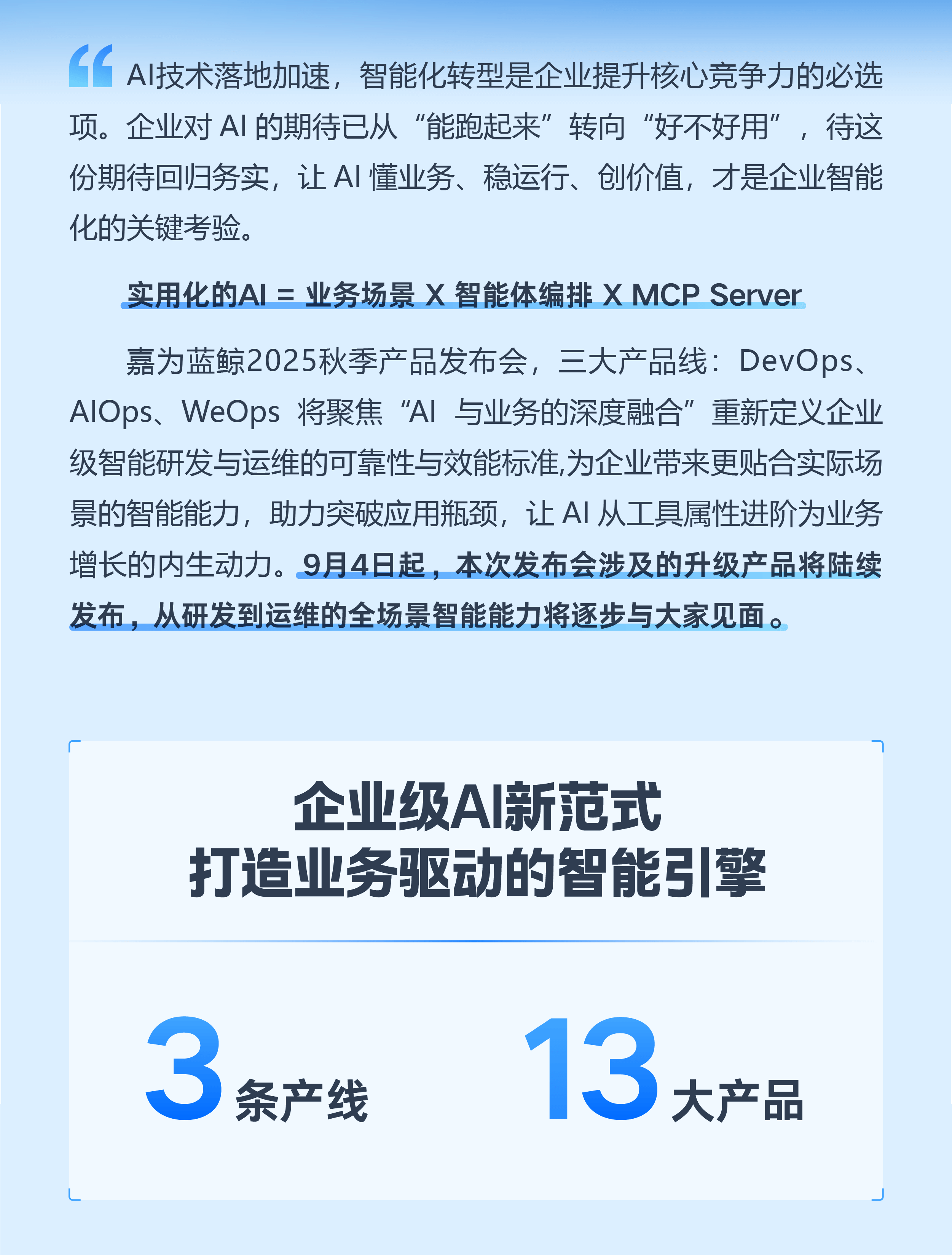 9月4日起!嘉为蓝鲸2025秋季发布会启幕,13大产品焕新,开启IT研运智能新程