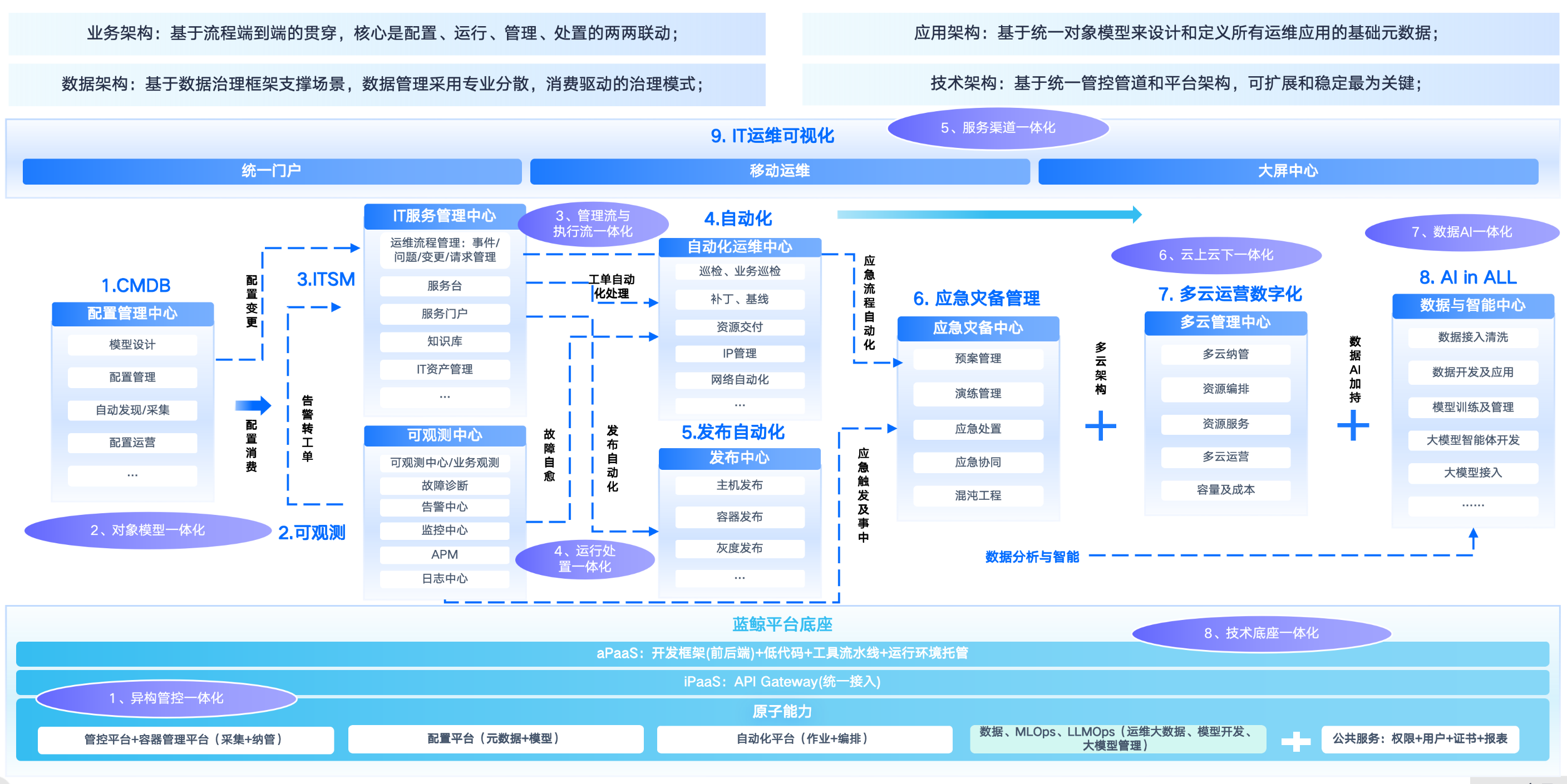在智能运维领域,嘉为蓝鲸AIOps一体化、平台化、智能化运维解决方案以 “全栈可观测+全流程自动化+全场景智能化” 为核心,八大模块环环相扣、协同发力,构建起覆盖IT运维全生命周期的闭环能力。