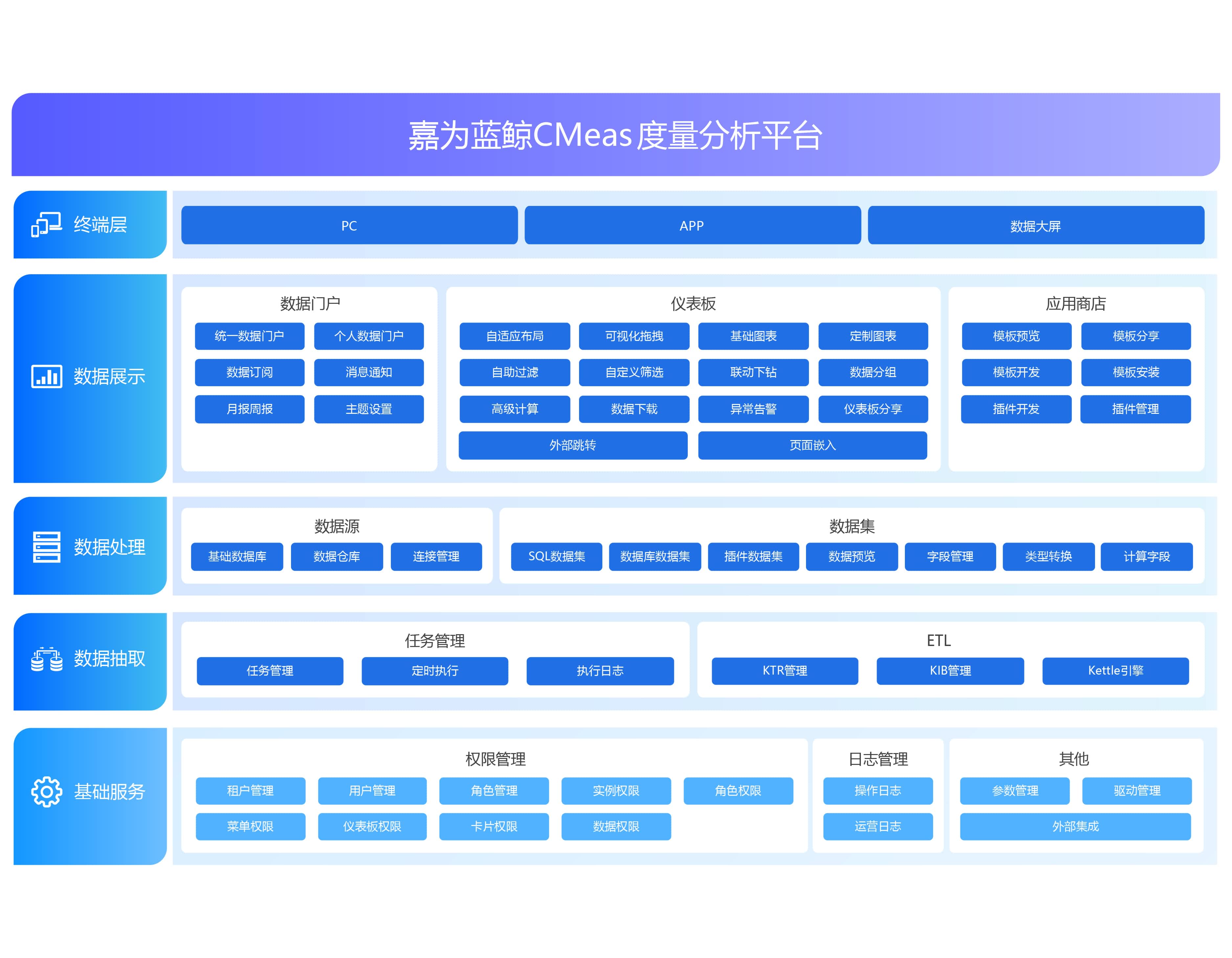 ● 应用能力-数据处理:支持数据源接入与数据集自定义,大幅降低企业度量工艺的开发、使用和维护成本。