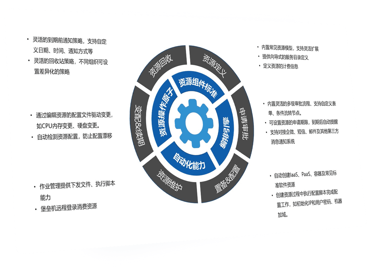 支持云资源的多种常见操作:配置详情、创建、删除、调整大小、开关机、重置密码、挂载/卸载磁盘、创建快照、回滚快照、绑定安全组、修改安全组规则、绑定弹性公网IP、负载均衡监听、负载均衡虚拟服务器组等等。