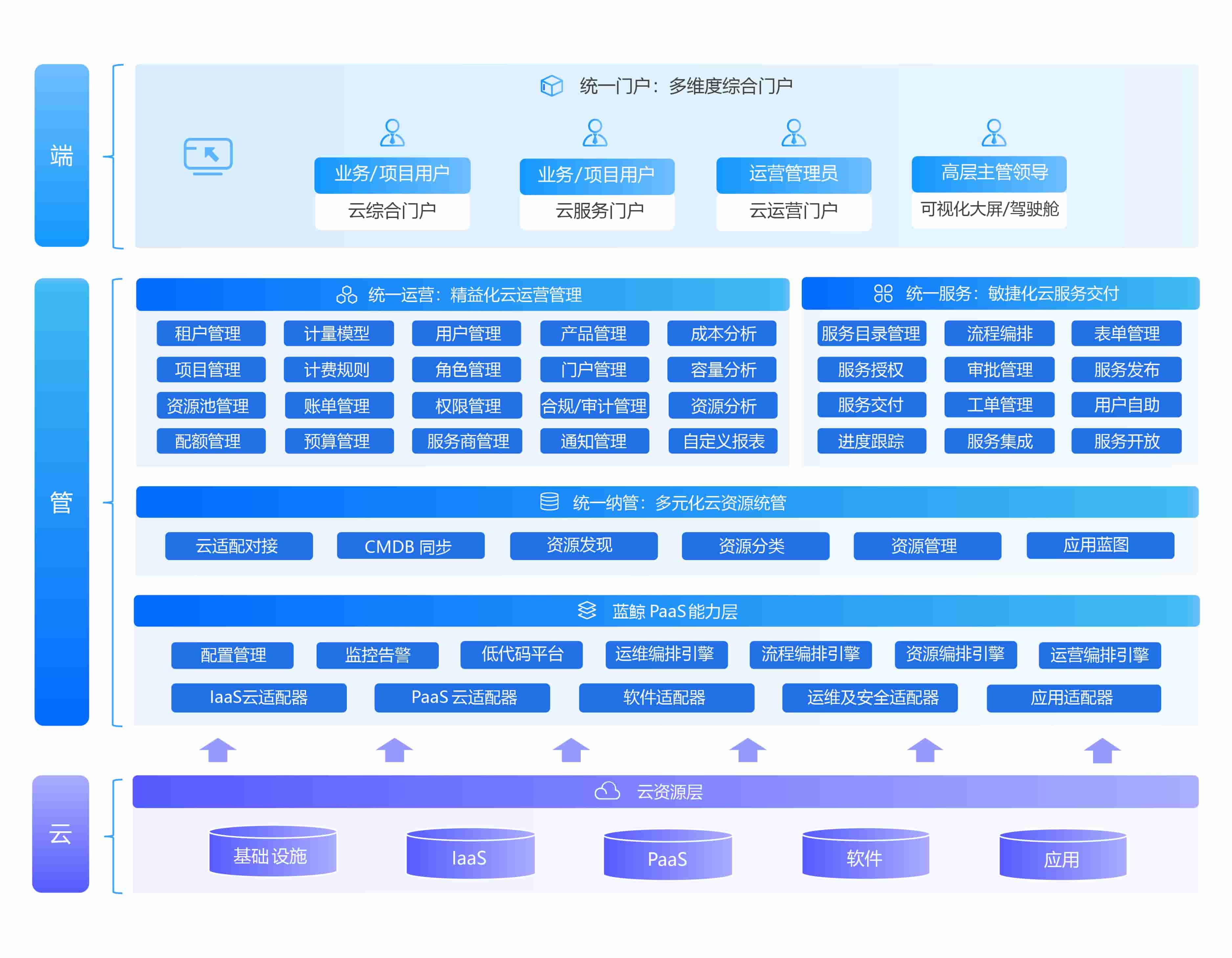 管:作为连接云与业务端的管道,提供统一纳管、统一服务、统一运营、多样化编排能力,实现管理标准化、资源服务化、交付自动化、运维场景化、运营持续优化,帮助管好云、控好云。