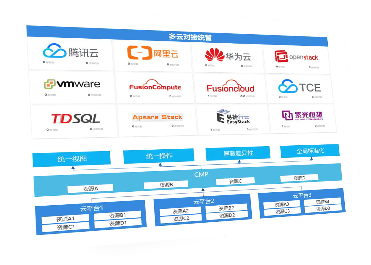 云:对云平台及云资源的全面纳管,将云资源组件化,支持快速对接及管理场景扩展。